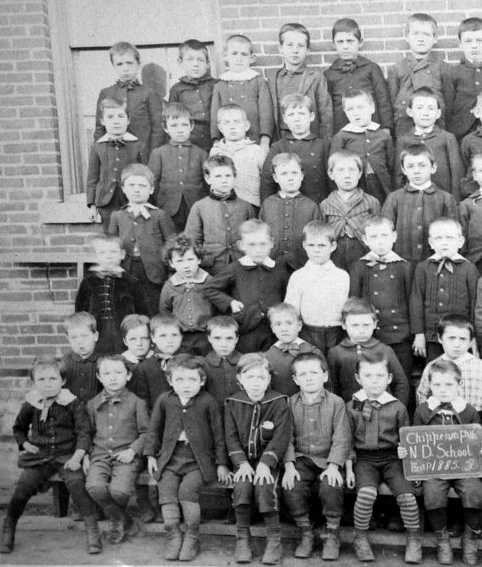 The French were the first Europeans to reach what is now Chippewa Falls. French explorer Pierre-Charles Le Sueur discovered the Chippewa Spring near the river (1700). Chippewa Falls is a city located along the Chippewa River in Chippewa County in central Wisconsin. It was incorporated as a city (1869). Chippewa is drived froim the Ojibwa Native Americans. Chippewa is an alternative English pronunciation of Ojibwa. Chippewa Falls began as a lumber town that became a railroad town. The originl railroad line of the West Wisconsin Railway went through Eau Claire, about 10 miles to the south (1870s). Thaddeus C. Pound founded the Chippewa Springs Health Club (1887). The springs were developed to bottle water which continues today. Many Germans emigrated to isconsin, including Catholic Germans. his bgan before the Civil War (1861-65). They were one of the few Catholic groups that did not settle primarily in growing cities. Because of the substantial Catholic school we see parochial schools opening in Wisconsin. The first Catholic school in the area was the Notre Dame School. It was supported by the Notre Dame Church founded (1851). Father Smidink built the first small school which was gradually expanded. We note a substantial brick building (1885). Unlike the public schools, the genders were separated in the Catholic schools. These are the first grade boys at the Notre Dame School in Chippewa Falls (figure 1). Most of the boys have suit jackets with widely varrying collars. Two boys seem to be wearing smock-like tunics. we see what look like velvet suits, but only one sailor suit. There are a few hints of Fauntleroy styling, but only hints. It ws 1985 of course that Mrs. Burnett published her book 'lLittle Lord Fauntleroy'. This shows that Fauntleroy styling was not entirely unknown, but eather limited and restrained at the time Mrs. Burnett wtote her book. Two boys look to have cropped hair and one boy with longish curly hair. Striped stockings seem to have gone out of style, although we still see a few examples.