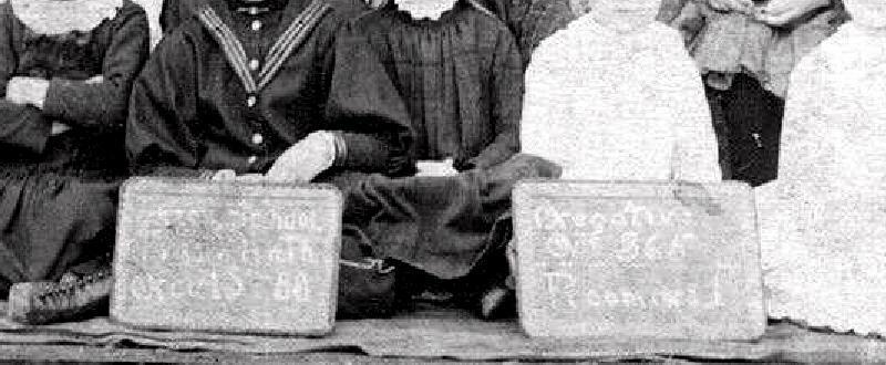 Here we have an a class at an unidentified Buffalo, New York school. It is a very large class of over about 45 children. They look like 2nd graders, meaning about 7 years old. Their tightly corseted teacher stands at the side. They are posed in front of their substantial brick school. They hold two boards which no doubt tell us all about the school, only unfortunately we can't make out the writing. Based on the clothing , it looks like the early-1880s just before the onset of the Fauntleroy Craze which began in 1885. The boys all wear suits, both collar-buttoning and cut-away jackets. One child wears a sailor outfit. Th child looks lik boy, but may be a girl. A girl behinf to the right also wears a sailor outfit. Several boys have detachable collars. Many boys wear boys, but none have the huge floppy bows so popular in the Fauntleroy era. Because of the jacket we don't see much of the blouses that they are wearing. The girls wear dresses. We don't see any girls wearing blouses and skirts, but several girls wear pinafores. The cabinet card is unusuall as not only does the image cover the enite card but it is 4.25 X 7.25 in, larger than the standard cabiet card. There is no studio information on the front, but a stamp on the back identifies the studio as Waterman & Co. in Buffalo. Copies cost $0.25.