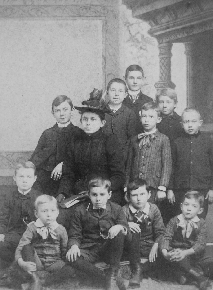 This cabinet card portrait shows a young woman, with a great period hat, and 11 well dressed boys. The boys all wear suits, a variery of styles aling with varied neckwear an collars. All the boys at the front wear knee pants and long black stockings. There is no writing on the back we are left to guess who the woman and boys are. We believe they are a either a private school group are a group the woman is tutoring. The boys look to be about 8-11 years old, suggesting that it is not a formal school group. Sunday school is a possibility, but then we think the boys would have Bibles. The mount and boys clothes suggest the 1890s to us, although we woul have thought there might have been more Fauntleroy touches. That might suggest the early-80s, but we think that black long stockings were not as standard then. The studio was Wing Taber in Auburn, New York.