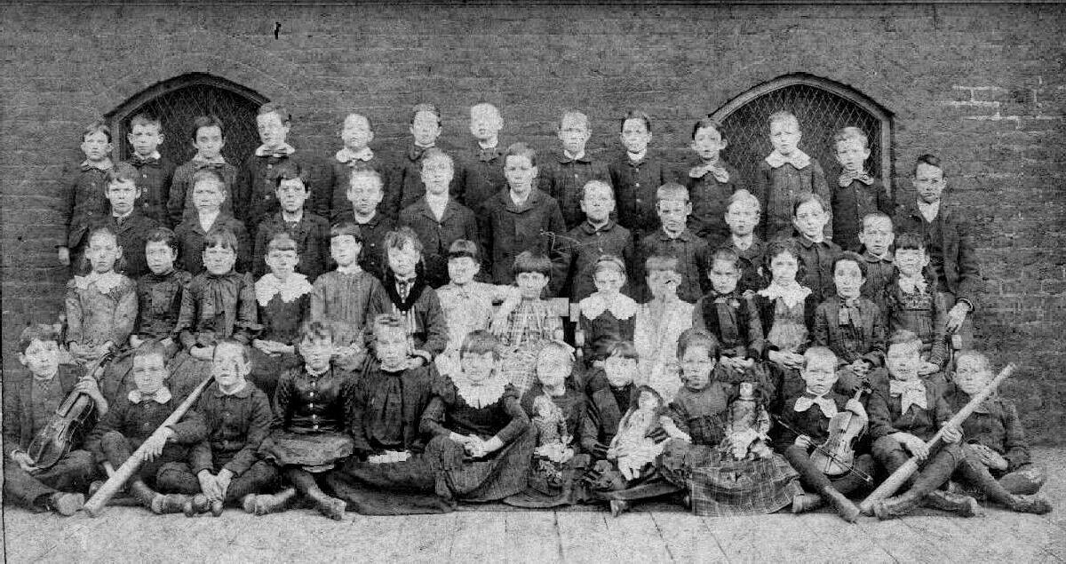 At first we only see occassional school portraits, mostly class or small groupsuually not identified. Gradually the school portait became an established school tradition. We see studios by the 1880s specializing in school portraits. This generally meant a large school portrait amd individual class portits. We do not see separate individual portaits until the 20th century. Here we have a potrait of a studio specializing in school portraits. The namne of the school is not provided, only a title -- Happy School Days. And we know it was located in San Framcisco, California. It looks like a public primary school. There is a substantial brick building. The class looks to a 6th grade class, 11-12 year olds. The boys display their violins and baseball bats. The girls their dolls. We can not make out a lot of detail. The girls wear dresses. he boys wear knee pants suits and long stockings. One boy wears a long pants suit, but we can only see the front row clearly. We do not see any Fauntleroy touches. This was very common uin the 1890s.