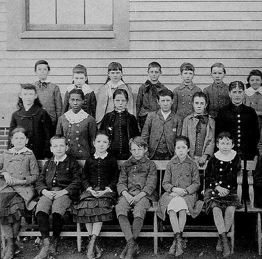 Here we see a group in front of their sizeable school building. We have no information as to where the photograph was taken, but as it must have been in the North as it was an integrated class. Notice that there is only one black child. Until the World war I era, blacks largely lived in the rural south. The childreall look to be about the same age. We would guess about 11 years old. This means that this was only one class at the school, cvonfirming that it wa a sizeable school. It is undated, but the estimate of the dealer is 1890s. That seems reasonable, but we might guess the early-90s or even late-80s. If it had been the mid- or late-890s the children wouild hasve been wearing mostly black long stockings. The children wear a variety of clothes, Many of the boys wear suits, but the jacket styles varied. Collar-buttoning jackets were popular, but we also see lapel jackets. Several boys wear blouses without jackets. Two of the boys have floppy bows, one rather large. The boys all wear long stockinghs, they look to be different colors. The girls all wear dressess done in many different styles. Several girls have white collars whoch look to be lace collars. Ruffles on the skirt seems stylish. The girls like the boys also wear long stockings, although one girl seems to have striped knee socks. Several girls have their hair pulled back so if we can not see aq dress, it is hard to tell the boys from girls.