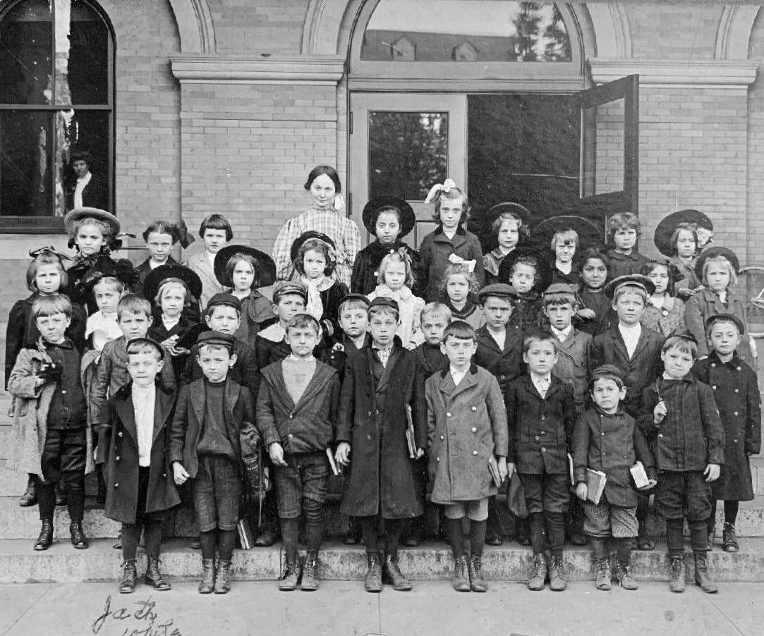 Here we have a cabinet portrait of a class in Waycross, Georgia. We are not sure what the name of the school was. It could have iust been kniwn as the Waycrioss School, although primariy (elementary) schools often had names. We can see tge buikding in the background. The town was founded just as the South's cotton economy was taking hold (1820). It is located in southeastern Georgiam near the Florida line. The town is known as the 'Headwaters of the Okefenokee'--just to the south of the town is the famed Okefenokee Swamp. The enscription on the back suggests the portrait was taken in 1910, although 1909 is possible. The children seem to be 8 year olds, suggesting that this is a 3rd grade class. The writing is a little indistinct, but one of the boys was apparently born in 1902 and we think he is 8 years old, suggesting the portrait was taken in 1910. As it is hard to read, we could be off a year or two, but not much more. Have a look at the witing and see if you can make out the writing any better. We think 1909-10 is very likely, in part because the boys are wearing both straight-leg knee pants and knickers. Kinckers first appeared in large numbers about 1908 and were virtually universal in the 1910s. An exception was younger boys who to an extent continued to wear knee pants. We think the boy's name is John Franlklin White. This is a particularly interesting image in that the children are ourside weaing their headwear and coats. The girls are wearing hats--sailor styles seem very popular. the boys are wearing suits and caps. Peaked caps (what the British call a school cap) seem the most popular, but we see some flat caps which would become the standard cap in the 1910s. Headwear on the 1900s was mixed. Peaked caps began to taken on social class conmotations in the 1910s while the flat cap likr lnickers became almost universal.