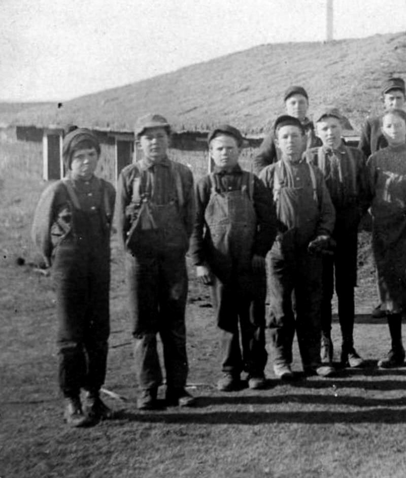 Unfortunately we do not know the name of this wonderful sod school. Note the stove pipe, presumably coming from a pot belly stove set in the middle of the room. They probably used cow 'chips' gathered by the children for fuel. There seem to be several windows. All we know for sure is that it was AZO photoback postcard photograph taken in 1912. We are not sure when the school was built, but it looks to be in good shape, probably it was rather new. (Sod schools and houses held up well in high winds, but they did not weather well.) We do not know where the school was located, but it was clearly somewhere on the Great Plains. Notice the flat background. We would guess the northern Plains, perhaps Minesota or the Dakotas. Sod schools and homes were also built on the southern plains. . This is a good example that no matter where a child lived in the United States, there was a school he or she could attend. There are 13 children, probably mostly first generation Americans. The boys mostly wear knee pants. The girls wear dresses and pinafores. All the children not wearing overalls wear long black stockings. The boys all wear caps. The girls do not wear hats, but we would guess wore them to school. Notice their teacher in the back.