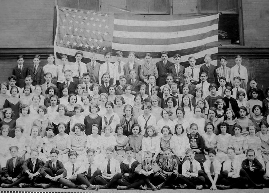 Here we see junior high school students. The school is not identified. The back of the portait has the name of two teachers, Miss Ryan and Miss Sniferest?, but there are some 100 children here, more than two classes. The dealer described it as a junior high school graduation. Junior high schools were 7th-9th grade between elementay (primary) schools and senior high school. Today middle schools are more common, usally 6th-8th grade. Without knowing the name of the schhol, we can not be sure about the grades. The children look like junior high school stidents, but we can not confirm that they are all from the graduating class which would be 9th graders, meaning 14-year olds. Notice that all of the boys are wearing suits or white shirts and ties with knickers and long stockings. Some of the boys may be wearing knee pants rather than knickers, biut this id difficult to tell. It is notable that not one boy is wearing long pants. And they are all wearing black long stockings. The portrai is not dated, but we would guess it was taken about 1910-12. We know this because knickers began repalving knee pants about 1909. And the flag here is before Ariziona enterd the Union (1913). Thus 1900-12 seems a very likely date.