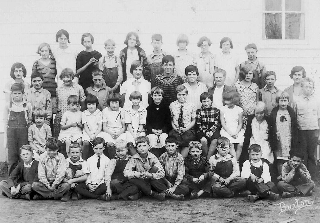 Buxton is a small towm towm on Northwest Oregon, a few miles inland. The Buxton on the photogrph my be the name of the photographer. There was a small school calpboard school with about 45 children. It appears based on how the children were dressed to have been to have been a farming and logging area. One boy wears a white suit jacket and tie with long black stockings. He is presumably waring knickers and looks rather out of place. The other boys as far as we can tell wear long pants, many overalls--basically work/play pants. The girls wear dresses. The portrait was taken in 1928. A new school was built in 1938. The school was closed as part of a consolidation effort (1998). It is now a Christian accademy. There is little information on the photograph, but it was in the estate of Elsie Meyer and it is identified as being taken in 1928. And is how we know that the photograph was taken in Buxton, Oregon and the inscroption on the photogrph is not just the name of the photographer or studio.