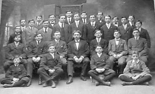A dealer believes that this class portrait was taken about 1928. A least we think ot is a class, we are not entirely sure about the ages of the boys in the portrait. The portrait is not real clear. The boys look like teenagers to us, but there seem to be several year grouops, say boys about 13-16 years old. The dealer tells us, "School photograph from around 1928. The portrait depcits a boy's school in New York. We don't know the name of the school, but it looks like a private school. The boy in the lower right hand corner as you look at the photo is Robert Eversfield, born 1918. He went to school in New York and appears about 10 years old in this photo." To us the boys seem more dressed like the 1910s, but we are not at all sure. The boys all wear suits, including both knickers and long pants. The portrait is blind stamped Scherer, Brooklyn, 489 Fulton Street. Presumably the school was near the studio. The backdropp is a studio backdrop not a school scene. The portrait is 9.25 x 6.5 inches and is glued to a tan mat, 11 x 14 in. Thus this is a large cabinet card, not a portrait in a paper frame that was the standard for the 1920s.