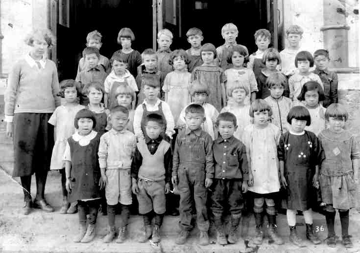 We do not know the name of this school, but we do know that it was a California school. We have an image of the first grade class in 1925. The boys wear a mixture kneepants, knickers, and overalls. The portrait is interesting because of the number of oriental children, I think Japanese. A very large percentage of the American Japanese population in the 1920s was concentrated in California and Hawaii. The reason we think they are Japanese is that this was a school in an obviously rural area. We think that the Chinese were more concentrated in an urban area. As many of the children wear overalls, I believe that this was a school in a rural area. Notice the placement of the children. Many of the Japanese children are in the first row. We wonder just why this was. Was this the position the children took on their own or were they arranged like this. One subject we know little about is how minority treated were treated in California schools. The photograph here suggests to that the Japanese children were well integrated into the school. The level of integration seems to us more prounounced than any where in Europe. These children are also the Japanese that were interned in World War II.