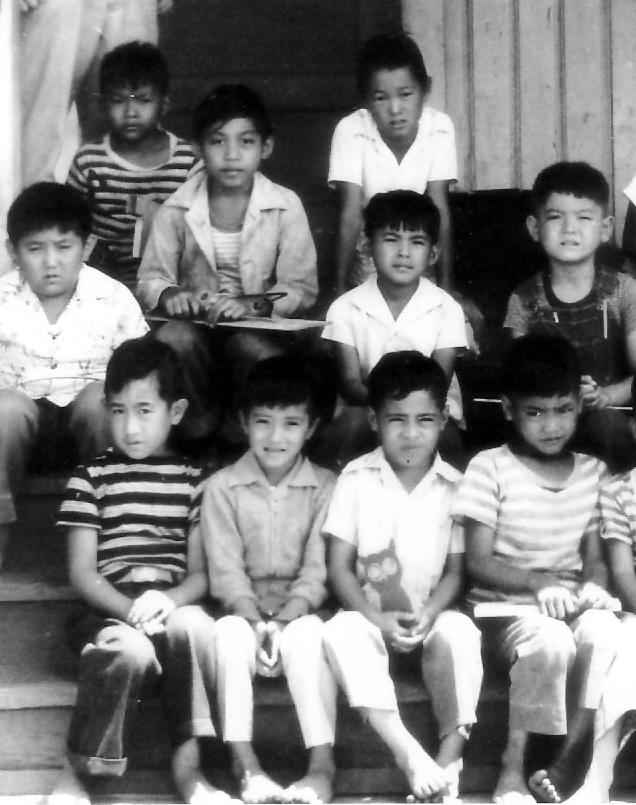 Here we have an unidentified school in Hawaii. All we know about it for sure is that it is an Hawaian shool. It looks like the late 1940s to us, but the early 50s is possible. Many of the children look to be Japanese Americans. After Pearl Harbor, the Japanese Americans in Hawaii were not interned like the Japanese Aericans on the Pacific coast, Apparently they were too important to the functioning os the Ialands. The children here wear striped "T" shirts and light-colored shirts with long pants. One boywears bib-fromt overalls. Curiously for a semi-tropical climate, the boys mostly wear long pants as would be common on the mainland. The boys are also barefoot.