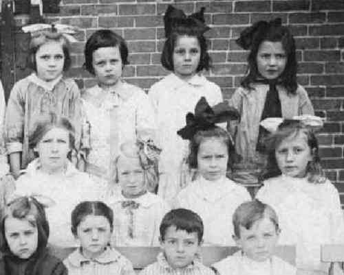 The photograph is no real clear. The girls appear to be wearing dresses without pinafores, but some of what look like white dresses could be pinafores. One noticeable trend is that they do not appear to be wearing the sailor styles which became very popular by the 1920s. The one accessory that seems to have been a fashion must was the hair bow. Note the ranges of sizes, position, colors, and patterns.