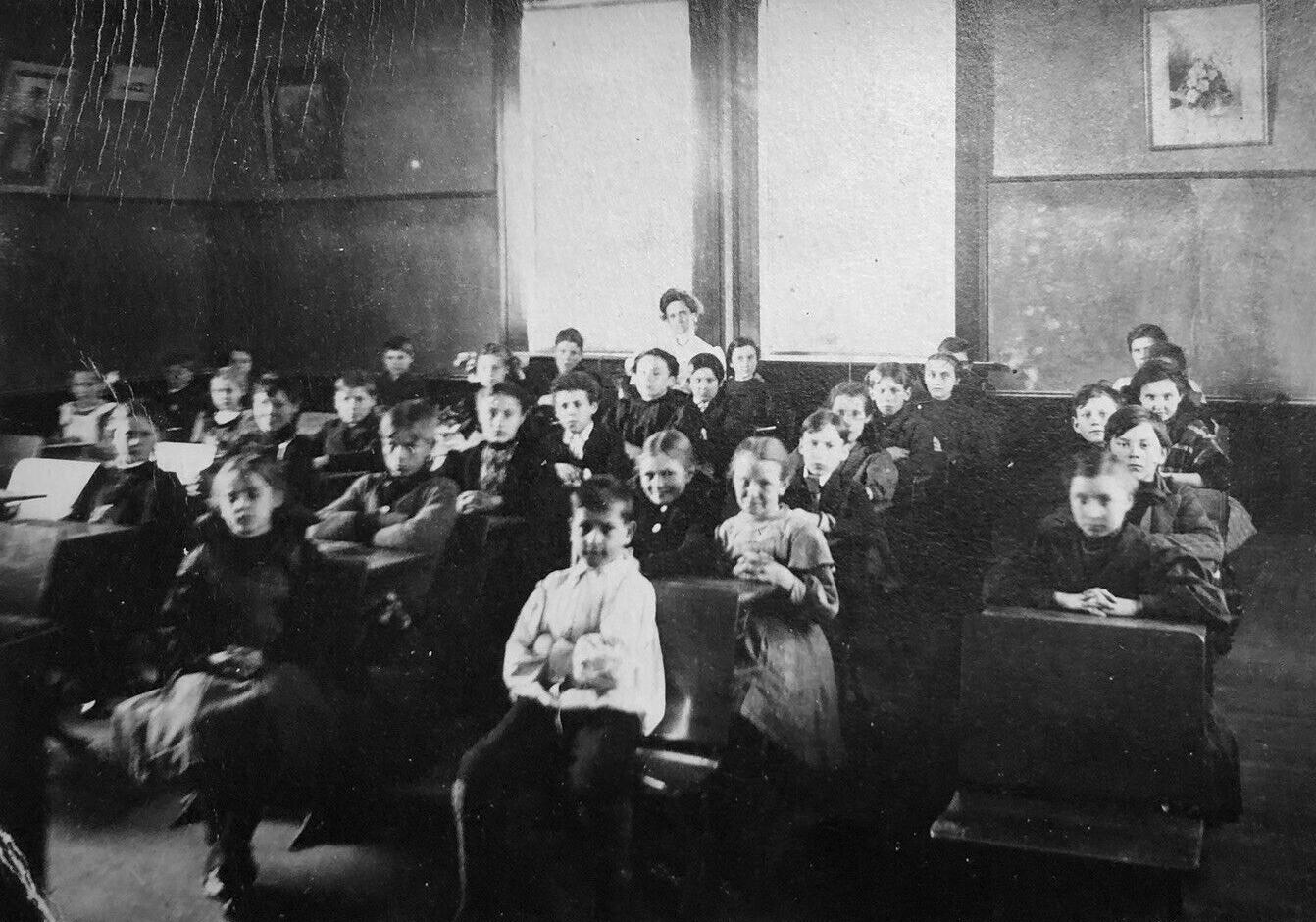 Most of the photographs available on rural schools are images of the children standing outside their schools. This was not unreasonable and we want to know what the schools looked like. The surroundings are also interesting and useful in understanding more about the schools. What we rarely get to see is the classrooms inside the schools. Part of the reason for this is the complication of taking photographs inside. The studios could this because of design or flash illumination. This was a problem out in the boondocks where rural schools were located. Early photography required long exposure times. This worked outside in he sunlight because shorter exposure times worked. Gradually technology advanced photography reducing exposure times. We see a few classroom images in the late-19th century, mostly the 1890s. Most of the indoor classroom photographs we have come from the 20th-century. We do begin to see a number of classroom images by the turn-of-the 20h century. The 1900s decade is the first decade in which substantial number of images are number. Even with one room schools, it is notable that all the desks are clustered together despite the wide age range, And the desks at the time were heavy iron and wood creations--not easily movable. Also notable is how bare-bones they were. Very little in he way of teaching aids or decorations.