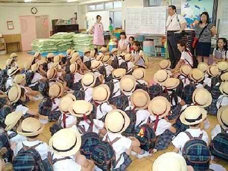![]() Figure 1.--Here we see children at a primary school wearing straw-colored wide-brimmed hats. Note the backpacks which match their skirts and shorts. |