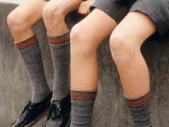 ts on the 1920s and 30s, but not as part of an official school uniform. It was more commonly worn by English boys going to a non-uniform school than adopted as part of a school uniform. More schools commonly adopted uniforms with solid color band. Some Australian schools had this style. We know of only one Australian school, however, that had this style by the 1980s and no English schools. I am not sure about the chronology of this. I am not sure if schools had kneesocks with color bands from when kneesocks were first worn or just when this became a standard fashion. The paterened top kneesocks, however, are clearly a fashion which first appeared in the 1920s.