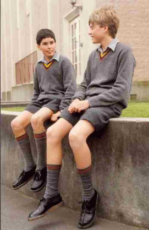 Only one New Zealand school in the 1980s had patterned lneesocks. These New Zealand boys wears parially paterned kneesocks with narrow yellow bands.