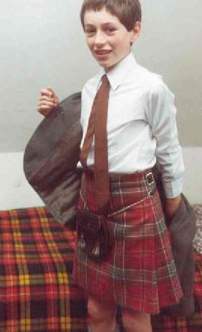 Figure 1.--Boys had many different opinions about the kilt. This Scottish boy in the 1980s didn't mind. Often non-Scottish boys attending Scottish schools didn't like the idea.  |