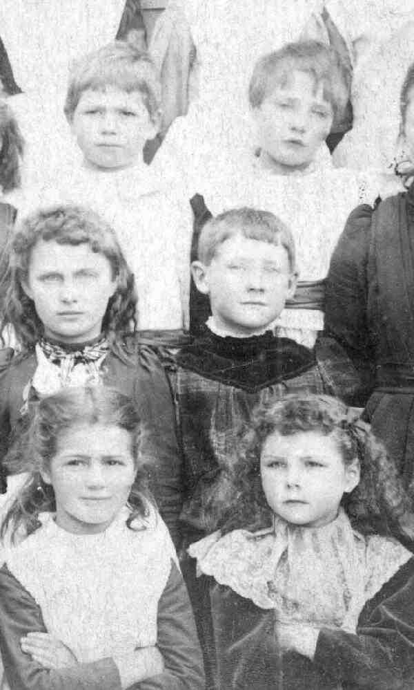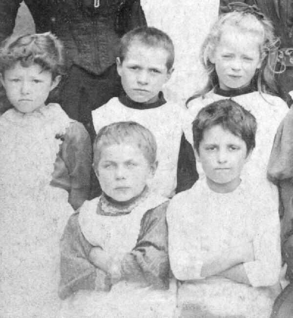 Here we see a school in Barnstaple, North Devon, England. The image is undated, bur we believe that it was taken around the turn of the 20th century. This image looks to HBC like it might have been taken a few tears begore the turn of the century in the 1890s. Normally it is relatively easy to identify boys and girls. Other times it is much more complicated. The photo is not in as good condition as the others but is possibly the most interesting as it the one where it is the most difficult to separate the boys from the girls. Theimage shows that it was not just in small village schools where boys wore pinafores. Notice that some of the boys where much more simple than the girls' pinafores. Some of our readers have written to say that children in the English school portraits who look like boys in pinafores are not boys, but girls with short hair. While many girls wore long hair, it is certainly true that many girls did have short hair. Here I am not sure why they or their mothers decided on short hair styles. Perhaps HBC readers can provide some insights here. We do know that after World War I that short bobbed hair was a popular style, but before the War we believe that long hair was seen as much more stylish. These short hair styles do complicate the identigication of the children. And there are some children that we simply can not identify. There are, however, some children that are very clearly boys. Often but not always their pinafores are more simple than those worn by the girls. The boys, for, example, seem to often have pinafores without the shoulder frills. For example in the image here, the two children to the left and white are dfinitely girls. I am not sure about the two children in the front (bottom) row, but the child in the middle is definitely a boy. Click on the image to see even more boys.