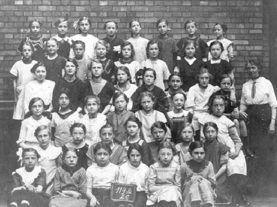 This class of German girls was probably photographed in the early 1920s. The slate reads 119Sch./2g". 119 Sch. presumably maeans Schule Nr. 119. The class presumably was 2g, meaning that it was a fairly large school. It appears to be a primary schoola nd these girls had only one more year before they finished. The girls look to be about 12 years old. Note that several wear plain pinafores.