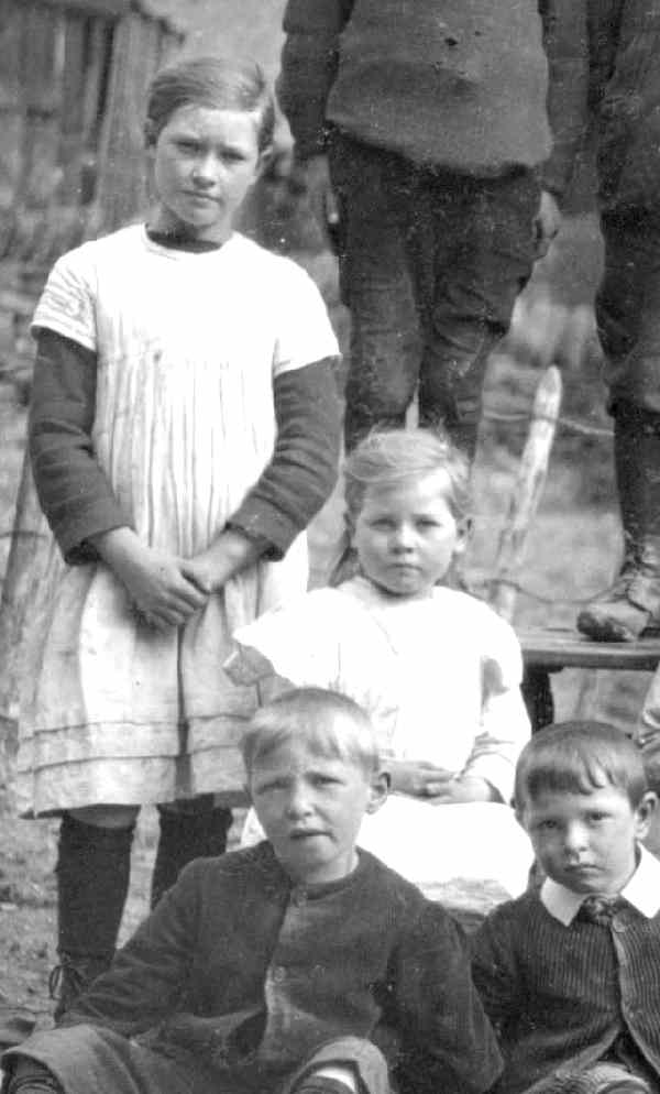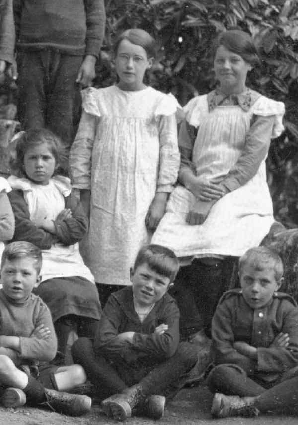 HBC thinks that the child with glasses on the right is probably a boy. Note the right part in her hair. Wecbelieve, however, that the child on the left looks very much like a boy. He has a left hair part. I think it is likely too that boys and girls would have stood together, note that is with the other child in a pinny that looks like boy. Also note the separation on the bench between him and the girls. Most telling, however, is the sleeves of the older boy in the pinafore. He is wearing the some kind of dark colored, beaten up sweater that many of the the other boys are wearing. Plus he seems to be wearing kneesocks with his knees or tops of his knickerbockers showing. The other girls are wearing dresses way below their pinafores or in the case of the child with glasses a very long pinafore. In addition, note that his pinafore, but not that of the younger boy, is different than those worn bu the girls. He does not have shoulder frills but rather plain short sleeves. This is very different than the pinnies most girls wore to school.