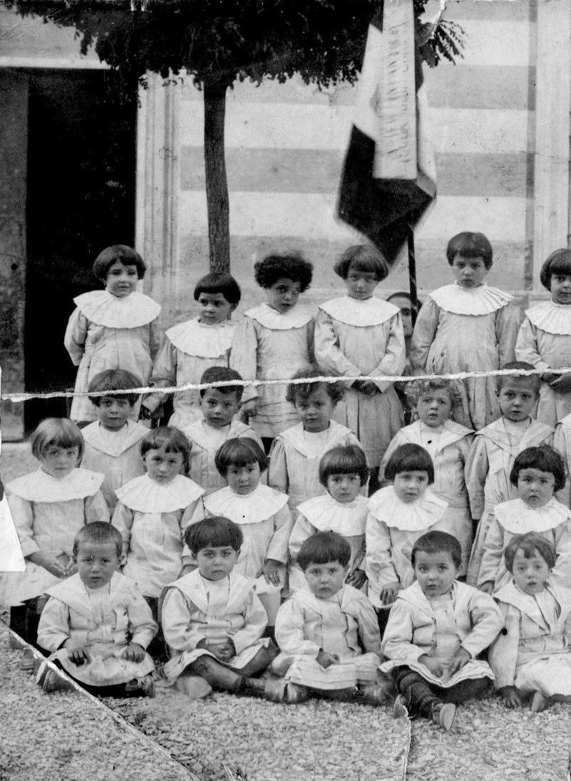 If that is the case, the word before could very well be JARDIN DE or just JARDIN." We do not notice Perivian school children wearing smocks, although it is possible that there could have been schools that had smocks kindergartners like the children here.