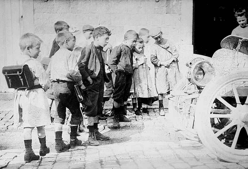 We do have some information on smocks during the early-20th century. We note quite a number of Belgian boys wearing school snocks in the period before and during World War I. We are unsure if there was any government regulations. The limited number of imafes we have archived suggests that not all boys wore smock, but many did. The styles seem similar--all back buttoning smocks. Collars and collsars differed. An image on our early-20th centiry chronology page shows boys wearing their school smocks with wide white collars and floppy bows on an outing. The school smocks look dark blue or black. One bow looks like it might have been red.The styles we see at the turn-of-the century seem all back-buttoning smocks. We see other boys wearing smocks without collars and bows. Our archive is very limited so we are not sure about which was more prevalent. We see light abd dark colors. Some images suggest that smocks were not required. HBC believes that the styles and popularity was similar in France and Belgium, at least among French speakers. We are sure, however, to what extent French styles were worn by Flemish boys and if this changed over time.
