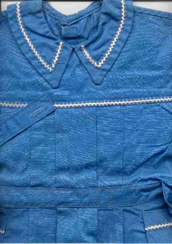 One common way of detailing school smocks was the use of "croquets". They were used for detailing both boys' and girls' smocks. We are not sure just when croquets were first used. We notice "croquets" being widely used in the 1950s, so presumably Croquets are braid trim added to clothing to give a chic look. Croquets for example are added to edge the collars of blouses, smocks, rompers, and dresses according the mother's sewing skills. The croquets were easier to apply to smoe parts of the smock than others. Normally they were applied to the collars, empiècement (chest), pockets, but there were some araes as well. Most of the crquets used on smocks were white, but some colored ones were also used. They were used on boys' smocks to about 10 years of age, but on smocks for older girls. There were various styles of braid. One popular style is a zig-zag croquet in white. Some were in matching colors, but most were in white or contrasting colors.