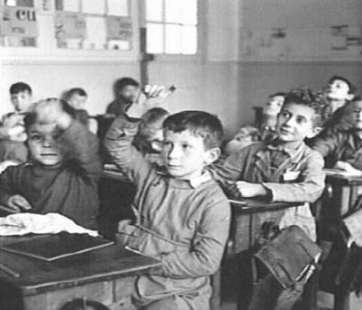 A French reader reports, "The photo above from the early 1950s shows a very typical French class. Boys commonly wore smocks with a variety of styles (back buttoning, front side buttoning or increasingly front middle buttoning). There were no school regulations requiring certain styles at most schools. Some boys may have not worn their smocks on any given day. Almost all of these boys probably wire short pants with their smocks, although that was also not required by the schools."