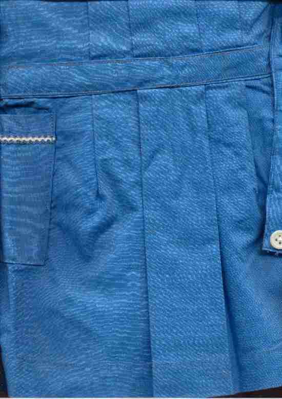 Some French school smocks had pleats. Most did not have pleats, but some did. We are not sure when smocks were first made with pleats. The first pleated smocks we have noted were in the 1920s, but there could have been introduced somewhat earlier. The limited information HBC has on early French school smocks providees no indication of pleating. We have noticed pleating on both boys' and girls' smocks in the 1920s. By the 1950s pleating was reportedly more common on boys' than girls' smocks. The pleating on boys' smocks tended to be very large pleats while girls' might have larger numbers of smaller pleats. Some girls smocks used a gathering technique rather than pleats.