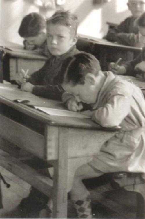 We have noted French school smocks in a wide variety of lengths.We have noticed styles from the ankles up to some only a little below the waistline. Some seem like long dresses. Others appear to be quite short, almost like a shirt others are quite long extending below the knees. And the length of French school smocks has changed over time. There are many other lengths between these two extremes in images from French schools. I am not sure if these style lengths are stylistic, or simply mothers not yet buying a growing boy a new smock. Often images show boys wearing generally similar length smocks, so stylist factors may be involved. Originally the school smocks were quite long, often lengths below the knee. The smocks in the late 19th century were worn quite long. The length od the smocks seemned to have reflected the length of pants and skirts because the purpose was to protect the clothes. Boys in the late 19th century commonly weore kneepants. As the pants extended to the knee and sonewtimes below the knee, the smock had to be a relatively long garment. Smocks after World War I (1914-18) were generally wore with short pants. The length of shorts changed over time as did the length of the smocks. Worn with shorts, the smocks by the 1930s were were generally shorter than had been worn earlier with kneepants. A French reader writes, "Some explanations about the French school smock during the 1940s-60s. To be smart, the boys' smock might be cut to lengths well above the knee. The smock should cover thge short pants. The lenghth of a smock was often designed to be about half of the heighth of a boy. In reality, mothers often purchased a slightly lasrger size to allow for growth. Often sewed up th hem which could then be let out when the boy grew a little taller.