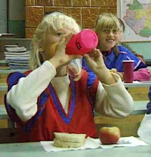 Most Hungarian school smocks appear to be long sleeved garments. HBC has noted in the late 1990s that short sleeved or sleevless styles appeared. These appear to be apron-like (or gardener-like) smocks for both girls and boys. They perhaps were introduced because some styles are buttonless and thus can not be unbuttoned. Some school authorities apparently thought it was not a good image for children to wear their smocks unbuttoned. Butonless smocks did away with this problem. They appear to have been made in different styles. There were collarless "V" necks as well as well as short sleeved front buttoning smocks. The buttonless apron-style smock appears to have been a style used more in primary than in secondary schools.