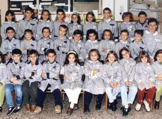 Figure 1.--The boys and girls at this Spanish school wear the same color of striped school smock. here are, however, stylistic differences between the smocks worn by the boys and girls. |