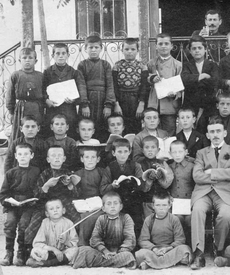 This school portait is a bit of mystery to us (figure 1). Most of the children are wearing smocks, although some look more like a robe than a tunic. The teachers look French to us, but we have never seen French boys dressed like this. We would guess that it might be French colonial Algeria, but we are not at all sure. We might guess Indo-China, but we do not see any Vietnamese boys. We are also unsure about the date. We would guess the 1910s, but the 'KLtd' stamp boxs on the back (1918-36) place in more in the 1920s. The boys seem dressed for a chilly day, but thehr officer at the top seems to be having a cool drink. A reader thinks it may be a Russian school. "I am wondering that if it is in the 1910s maybe this is a Russian school as the robes could be from some of the Russian ethnic areas that were mostly Muslim. There were many private schools in Imperial Russia so that may explain the differences and it would also explain the buzz haircuts of many of the boys." Thus is a possibolity, presumably in the provinces, Siberia, or Central Asia. Russian boys did have short hair cuts in the early-20th century, but so did many European boys (includung the French and Germans), although after the War buzz hair cuts like this went out of style. Some of the outfits the boys wear do look like the robes boys wore. We do not see, however, any Asian looking faces. Also the teacher looks exceptionlly well dressed, more French thn Russian. The date is also a problem. The KLtd. postcard stamp box appears to have first appeared in 1918. This Would be the Bolshevik Revolution-Civil War era and the ensuing early Soviet era. The fashionably dressed teacher does not fit in with Central Asia or the Soviets. He does look Fremch which would suggest Algeria.