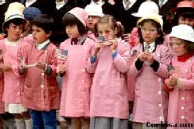 Figure 1.--The boys and girls at this Portuguese school wear pink smocks. Note the destincvtive square collar.