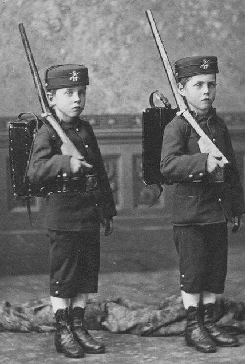 The basic Civil War style uniform was adopted at military schools throughout the United States. The portraits we have seen show blue uniforms. There may have been some grey uniforms, but perhaps not immediately after the War. Of course West Point had grey uniforms. But most military schools had uniforms similar to actual U.S. Army uniforms as they were blue. The Civil War styled uniforms continued for some time at American military schools. After the War some schools adopted kneepants uniforms. We are not sure when this occurred, but believe it was well after the War, perhaps in the 1880s. This varied widely from school to school. We still see Civil War style uniforms being worn into the 1880s. We see some schools updating their uniforms in the 1890s. Basically they were following changes in U.S. Army uniforms. We do notice some more varied uniforms, but we are not entirely sure they were school uniforms. They seem rather elaborate, however, for play uniforms.