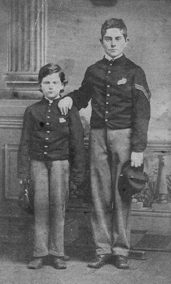 The basic Civil War style uniform was adopted at military schools throughout the United States. The portraits we have seen show blue uniforms. There may have been some grey uniforms, but perhaps not immediately after the War. Of course West Point had grey uniforms. But most military schools had uniforms similar to actual U.S. Army uniforms as they were blue. The Civil War styled uniforms continued for some time at American military schools. After the War some schools adopted kneepants uniforms. We are not sure when this occurred, but believe it was well after the War, perhaps in the 1880s. This varied widely from school to school. We still see Civil War style uniforms being worn into the 1880s. We see some schools updating their uniforms in the 1890s. Basically they were following changes in U.S. Army uniforms. We do notice some more varied uniforms, but we are not entirely sure they were school uniforms. They seem rather elaborate, however, for play uniforms.