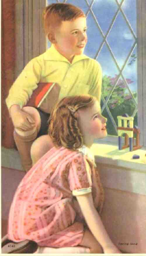 ![]() Figure 1.--This scene from a calendarm probably in the 1930s shows children in a play room looking out the window to create a spring scene.< /i> |
