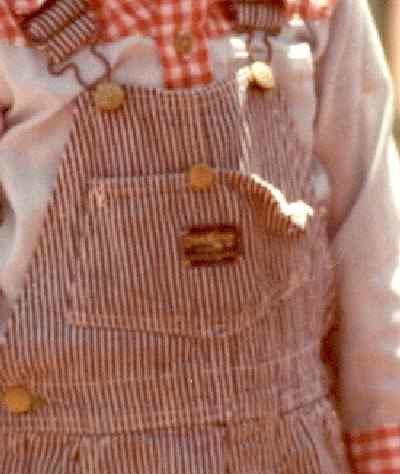 The original overalls were made of canvas sheeting. Blue denim soon followed and became stromgly associated with overalls. Overalls were, hpwever, made in many different materials--not just denim. Both blue and black denim were available. There were overalls in also khaki cloth. There is also safari drill--I'm not sure what this was. One popular style was stripped drill--often referred to as railroad overalls because it was commonly used in the old time railroad employee hats and overalls. The overalls available for boys in the 1990s was a much larger range of materials, including corderoy, canvas sheeting, and other materials. The primary company using the stripped material was Oshkosh. The pattern consisted of thin vertical stripes of white and blue.