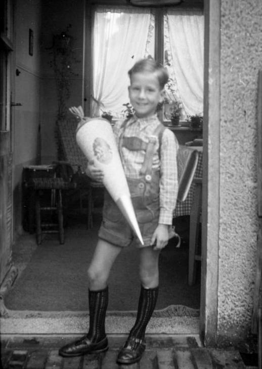 We see many boys wearing Lederhosen to school. They are a popular garment for First Day portraits. We know the boys were 6 years old in these portraits. It was very common to take a keepsake portrait on the first day of school. We notice both snap shots and formal studio portraits. Many are easy to identify because the children have gift cones. Other ages are more difficult to assess, but the gidt cones make it easy. This seems most common in the 1950s and 60s, but we notice boys wearing Lederhosen to school both before and after. Before World War II, Lederhosen were most pronounced in Bavaroa. After the War, they begin to bvecome popular in other areas of Germany, especially in the 1950s.