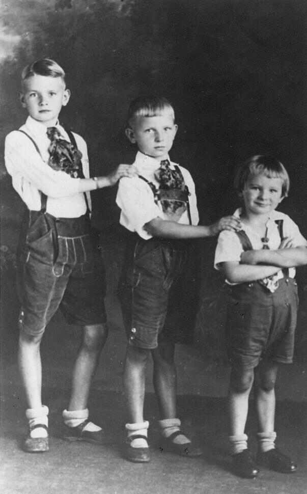We note some families with all or most of the boys dressed in Lederhosen. This was at a time when mother mafe the clothing purchases with little or no input fom the children. Thus we see many familiescwith identical or coordinated clothing. Here a vsariety of factors caused variations in family practice. Age was one of them. We note examples of all the boiys in a family wearing Lederhosen, except the younger boys. After World War II, the preferences of the children became more important. One German reader has written us me describing how during the 1960s he didn't like Lederhosen, but his brother did. Before the 60s, however, boys until into their teens had relatively limited input into their clothing. Thus we do see families with all or most of the boys wearing Lederhosen. This of course varied from family to family. Not all mothers believed in dressing the children alike, but quite a feww did. And Lederhosen were one of the choices. Different mothers had varying fashion attitudes. Three were also regional and demographic differences. There were also social-class differences affecting both tastes and family income levels. Lederhosen as they were leather were relatively expensive. These factors all affected family choices. We do not understand how these factors played out to be able to assess the families that we see with the children wearing Lederhosen.