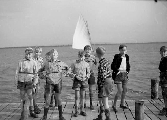 While hiking and camping seem to have been the most popular outdoor pursuit in which Lederhosen were commonly worn, we also notice them being worn on boating trips. One might think cord or other fabric shorts would seem more practical for boatng. Nevertheless German boys also wore Lederhosen for boating. Here the problem was that cords and other fabrics could be easily dried out if they got wet. Soaking Lederhosen was, however, one of the few things that could damage them and they could not be easily or rapidly dried out