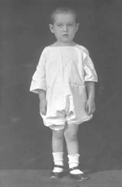The collar design of romper suits could vary substantially. Some romper suits were made with Peter Pan collars, although the collar was often not white. The Peter Pan collar was the most common collar for those suits with collars. On many play romper suits the collar was the same material as the suit.We have noted some rompers without any collar at all. The head opening was sometimes done rather as a square sailor-type cut. This was a common design for play suits. The romper suit the Texas boy here is wearing has this square opening. the suit here looks to be a play suit. There were also rounded cuts neck openings.