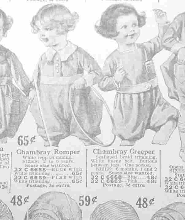 HBC has little information about the colors rompers were made in at this time. They were presumably mae in a variety of colors. Some photographs show rompers made in black. These seem to be the more formal rompers. Play rompers were probably made in a wide variety of colors. One leading merchandizer in the early 1920s showed rimpers available in mostly blue and pink. Notably both the infant creepers and the rompets for older chilren were both offered in blue and pink. Presumbly other retailers offered rompers in a greater range of colors.