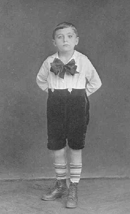 German boys extensively wore button-on clothes. We have noted many images of younger boys wearing button-on outfits. We do not yet have a complete chronology. We do not have any images from the 19th century, other than the skeleton suits worn in the early 19th century. This may in part reflect our limited archive of 19th century German archive. We have, however, numerous images from the early 20th century. Perhaps more common in Germany were suspender pants--both shorts and longs. We note numerous images of German boys wearing button-on clothing in the early 20th century, from the 1900s through the 20s. The photograph here shows a German boy about 1915 wearing a button-on suit and fancy blouse. We note two German brothers wearing button-on outfits in the 1920s. This German boy was photographed in a button-on suit during 1915 (figure 1). Notice the very large buttons. We note many one-piece suits before World War I, but after the War separate pants and shorts were much more common. The style seems to have declined in the 1930s. We see few such outfits by the 1940s.
