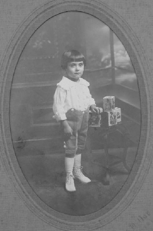 The child is wearing a banged hair cut. A white button on blouse with a large ruffled collar with a ruffled [?placket]. The long sleeves have ruffled button cuffs well above the wrist. I'm not sure if this is the style or if the blouse is a bit small for him. He is wearing knee colored kneepants, but I am not sure about the color. The kneepants have waisr buttons from the blouse. Notice how the waist rises where the buttons are. The keepants also have white ornamental leg buttons. He also has whote kneesocks and white high top shoes.
