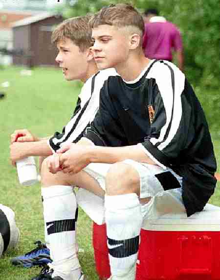 What every national soccer team aims at of course is victory in sorld cup. Each nation forms a national team from the various teams competing in their country. This is complicated somewhat by the fact that many teams employ foreign players. Some players can claim dual nationality. Other countries such as England have several national teams (England, Scotland, Ulster, and Wales). A British reader writes, "I can send you a picture of boys dressed in the kits of some of the countries used to promote British TV coverage of the last World Cup (held in Australia and which England famously won with the last kick of the game). All the teams are not represented--England are twice for some reason! - the boys at left and third from left. You can the red rose logo. (My Yorkshire cousin who also played Rugby (Union) at school hated this. As you'll know, Yorkshire is the White Rose county as opposed to fierce rivals Lancashire who are Red Rose). I don't know why England picked the Red Rose. probably because the shirt is white. The proper socks are red, as the boy far left has. The boy second left wears the famous strip of the 'All Blacks' - New Zealand ,and the fourth