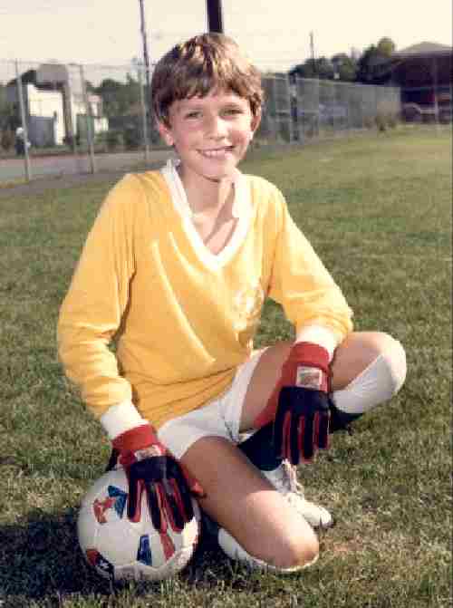 There is one position on the team, however, where the member is uniquely dressed, in a seperate colored or designed jersey. This position is that of "goalie." This boy in the scans is shown in his regular colored uniform of green shirt with white trim, white shorts, and green knee socks with white tops. When he played the position of "goalie," he changed to his yellow shirt, and donned a pair of gloves (apparantly to help him stop the ball easier). Gloves, because the goalie is the only player allowed to use his hands to touch the ball. Although his knee socks appear darker, than in his regular uniform picture, they are the same green. The only difference is that he apparantly didn't turn down the tops to below his knees, but, rather, actually pulled the socks even higher so that they almost reached above his knees.