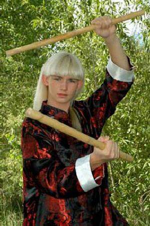 Figure 1.-- Movie actor and martial artist Matthew Helm is skilled in Escrima which involves the use of sticks. His costume is not Filipino and would not be approved by Escrima purists. It is more of a Hollywood creation suggestive of Chinese martial arts. |