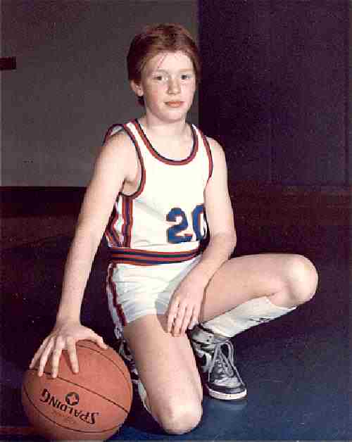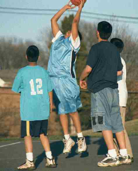 ![]() Figure 2.--Basketball uniforms changed in the 1990s. Boys began wearing larger jerseys, often over "T" shirts, with longer, baggy shorts. |
