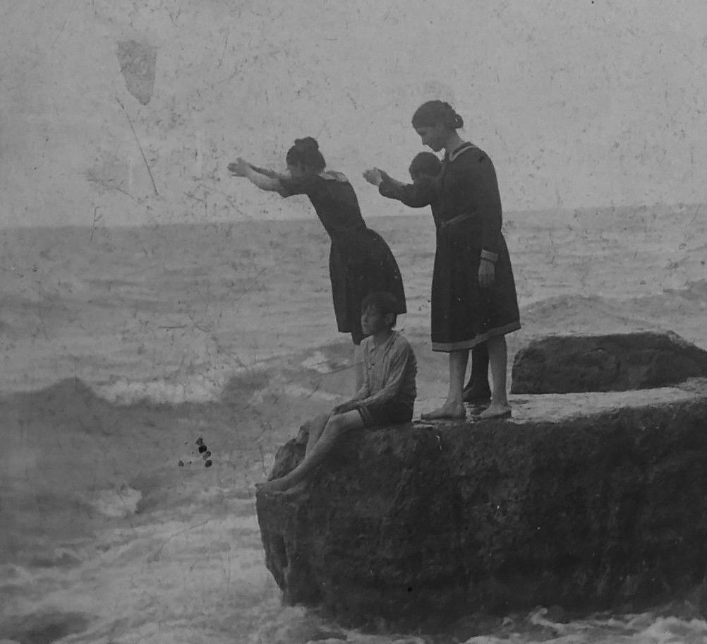 Most of our images of 19th century bathing suits come from the 1890s. This is because of the vast number of photographic portraits taken. We see many more portraits taken at beach resorts. This reflects the devekopment of Anerica's industrial econonmy. More and more American wanted to go on seaside holidays and could afford it. And by the 1890s resort hotels were develooped at important seaside locations in the Northeast and Mid-Atlanntic states, although Florida was not yet a major attraction. Most bsthing suit images were taken at the resorts so until the resorts were well established we do not see many of the images. In addition, amateur family photographs were beginning to appear. They were still limited in number compared to studio portraits, but at least we have some. As far as we can tell bathing costumes did not change much in the 90s. The boys outfits were something you could swim in, but it is kind of hard to see how the girls were able to swim, especially with long stockings. Bathing caps were almost universal at the beachfor the girls, but usually not worn in studio portraits. We are not sure just why girls wore them. As far ase can tell it was hair styling. Many girls had long hsir and spent considerable time styling their hair. they did not want sea water messing up their styling. There would be other reasoins in the 20th century, but this seems to have been the reason in the 1890s.