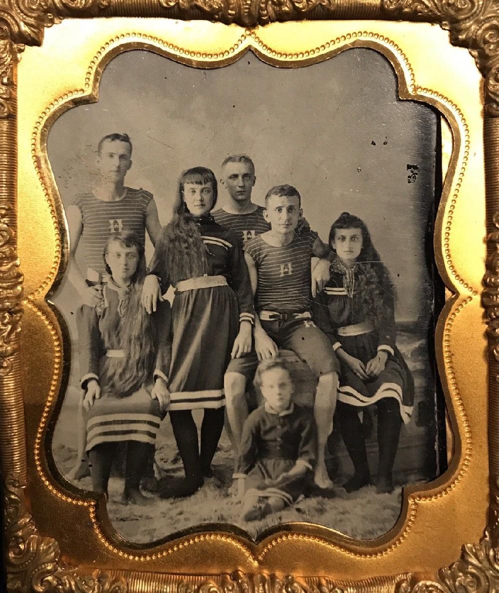 We only begin to learn about bathing suits in any detail with the developmentt of photography (mid-19th century). Coincidentally this was about the same time that Americans began taking an interest in seaside resorts. The railrioad sytem also develooing at about the same time. The photographic record provides a detailed record of the ebolution of bathing suits. We have no information on American bathing suits in the early-19th century. We suspect that most boys didn't wear suits when they went swiming in the proverbial 'ol swimming hole'. We are less sure about girls. We suspect that they were less likely to go swimming. Seaside resorts will still not well developed in the mid-19th century. This changed drmaically in the late 19th cetury. The wealth created by indistrialization made vacations posible and the railroads provided the mobility to easily reach the seaside. And photography has left us countless images of bathing suits. By the late-19th century we see men and boys wearing coordinate shirt and knee-length pants, mostly done in wool. Bold stripes were very popular for these suits. We are not sure about the colors. Women and girls wore what looked like knee-lengrth dresses, commonly with dark long stockings. They were less likely to be striped, but we commonly notice strips at the skirt hem. Men might have short sleeves or even sleveless tops, but women usually had long sleeves. The boys outfits were somethingbyou could swim in, but it is kind of hard to see how the girls were able to swim, especially with long stockings. Bathing caps were almost universal at the beachfor the girls, but usually not worn in studio portraits.