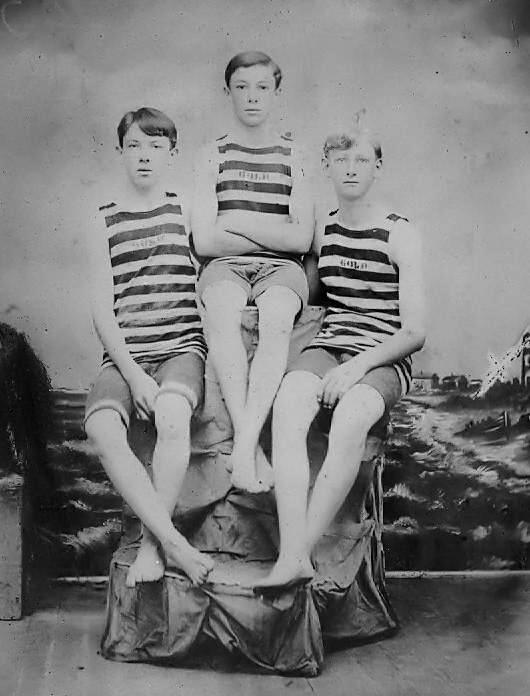 We know a good bit about bathing suits, but only with the developmentt of photography (mid-19th century). The photographic record provides a detailed record of the ebolution of bathing suits. We have no information on American bathing suits in the early-19th century. We suspect that most boys didn't wear suits when they went swiming in the proverbial 'ol swimming hole'. We are less sure about girls. We suspect that they were less likely to go swimming. Seaside resorts will still not well developed in the mid-19th century. This changed drmaically in the late 19th cetury. The wealth created by indistrialization made vacations posible and the railroads provided the mobility to easily reach the seaside. And photography has left us countless images of bathing suits. By the late-19th century we see men and boys wearing coordinate shirt and knee-length pants, mostly done in wool. Bold stripes were very popular for these suits. We are not sure about the colors. The trunks after the turn of the century began to be cut shorter. And after World