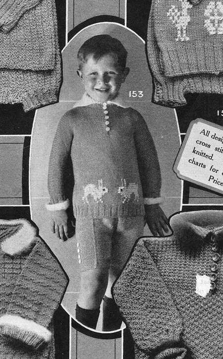 We begin to see knitted shorts sets in the early-20th century. We do not have a detailed chronology yet, but we believe thet became especially popular after World War I in the 1920s. We see them earlier, but they do not seem to be a major item until the 1920s. Sweaters of course were a common garment earlier in the late-19th century. Matching pants were a new feature. The pants varied in length. We see some of these sets for younger boys done as long pants, but short pants seem more common. This was especially the case by the 1920s. The shorts tended to be done shorter by the 1930s. This was a general trend in children's clothes at the time. These were winter sets en though they were commonly done with shoets, We notice both knitted and crocheted sets. Thwy were often knitted at home, but could be purchased in the stores as well. They were mostly done for pre-school boys, but younger primary boys might wear them. After World War II we see younger boys wearing them. mostly babies and todlers to about 3 years of age. Some were plain. Others were had colorful designs that appealed to younger childrem.